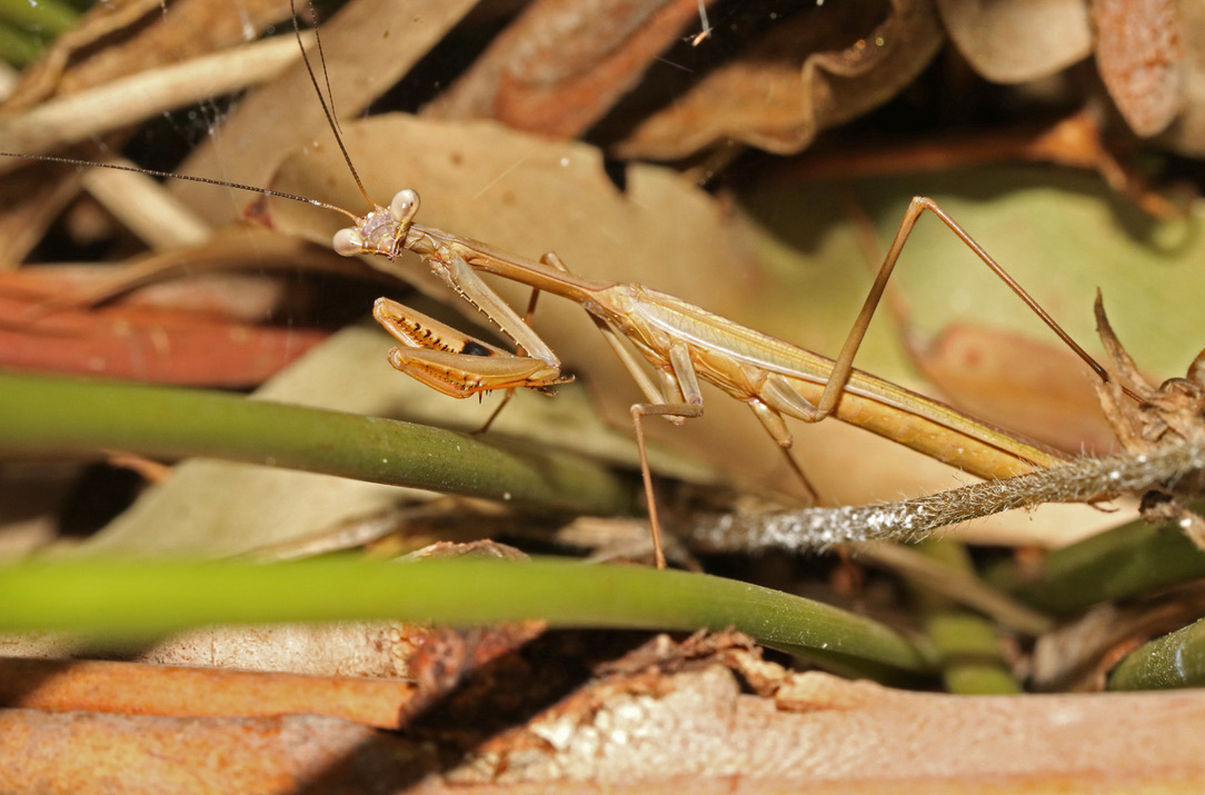 - False Garden Mantis (F) (Pseudomantis albofimbriata): this is one of two common local Mantids. This species comes in two colour forms, ie light brown (as in the photo) or a bright green. These are fierce hunters.