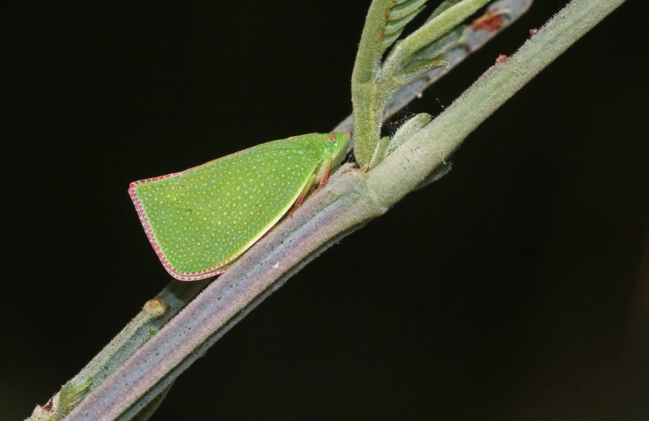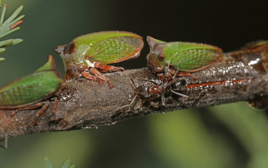 - Green Treehoppers: often seen near the Common Imperial Blue butterflies, are these sap sucking insects, the Green Treehopper; Sextius virescens. In the picture you can also see some ants of the genus Iridomyrmex. These ants tend both the butterflies and Tree Hoppers to collect the sweet, energy rich substance they exude as a by-product of their tree-sap diet.