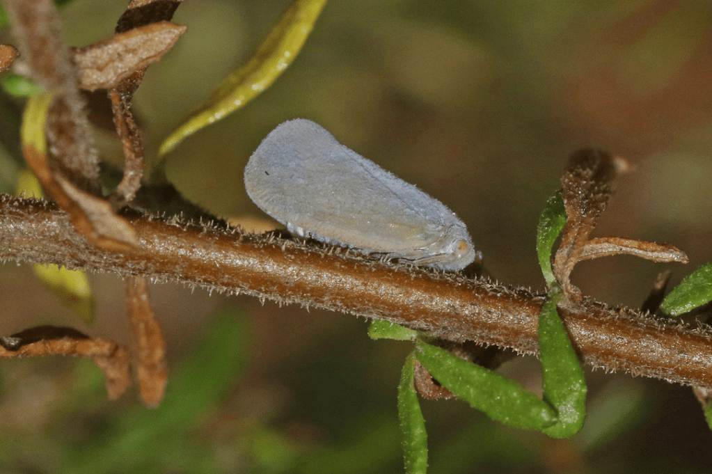 - Grey Plant-hopper (Anzora unicolor): these are a very common sap sucking insect. Their immature nymphs are very fluffy and powdery white. A (usually) minor pest in the home garden.