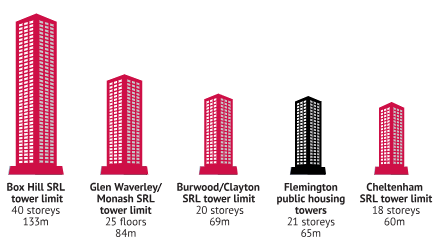 Unlike most SRL Activity Centres, Box Hill is slated for very high rise 40-storey buildings. By way of comparison, Burwood further down KooyongKoot (Gardiners Creek), the limit is 20 storeys and Glen Waverley’s is 25. Here’s how they compare (also showing the Flemington Housing Commission high-rise towers):