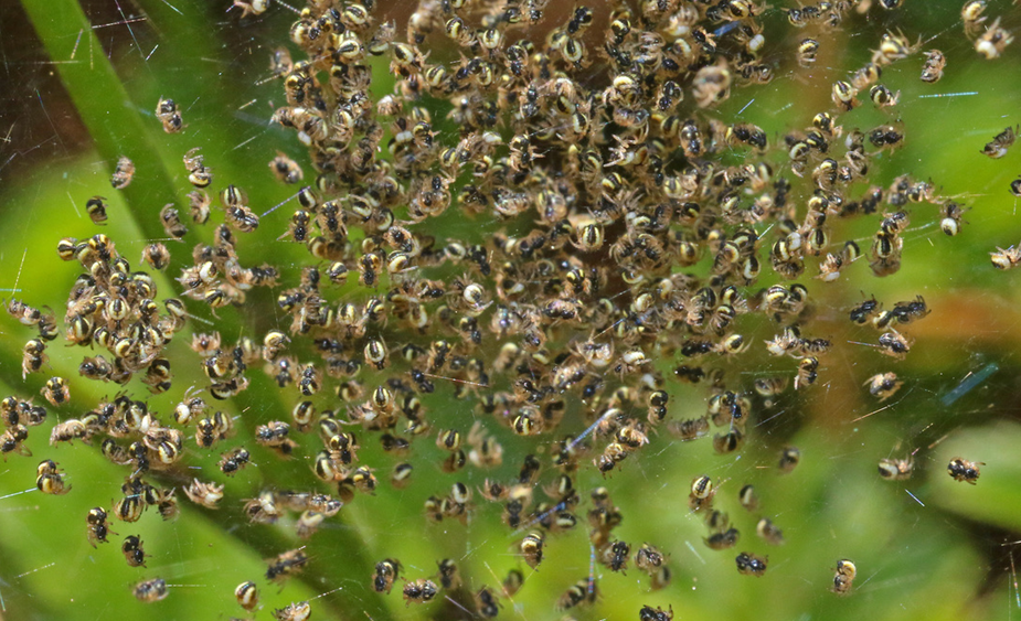 Some species, such as this one, emerge from a cluster of eggs and form a tight grouping of tiny spiderlings. These disperse after a few days.