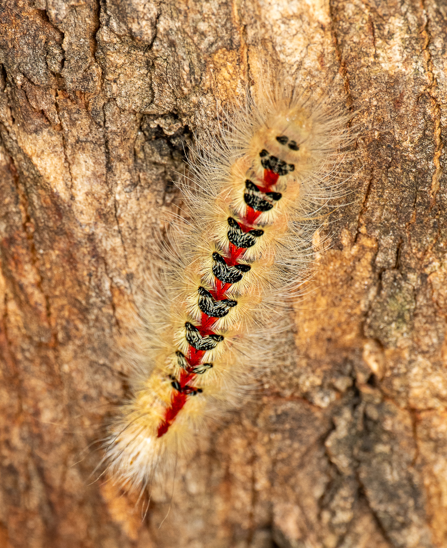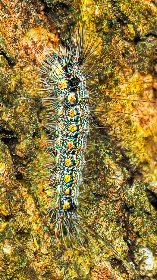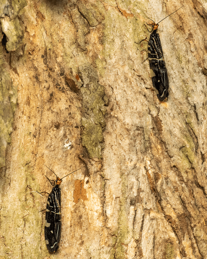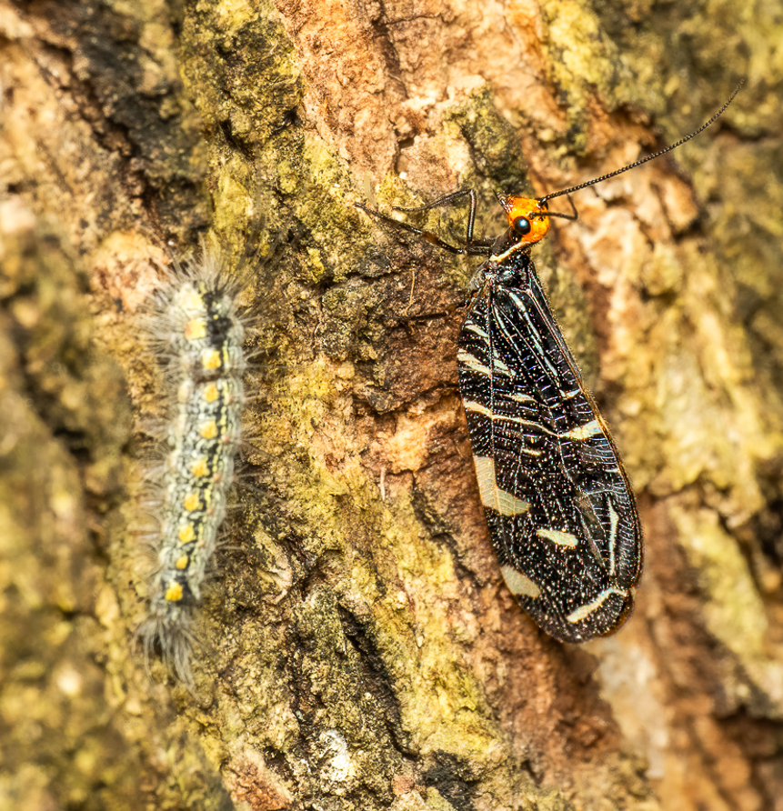 It is not unusual to find them in pairs like our photo. The caterpillar shown on the same tree is not related to the Lacewing but rather a caterpillar of the Clouded Footman moth.