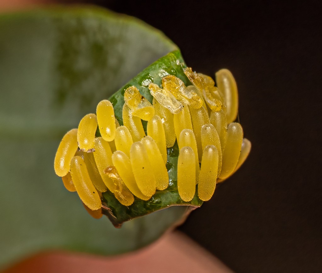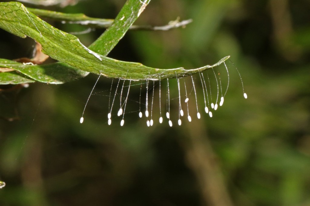 - Green Lacewing Eggs (Family Chrysopidae): the female Lacewing lays her eggs on stalks so that the aggressive larvae don’t immediately eat each other when they hatch.
