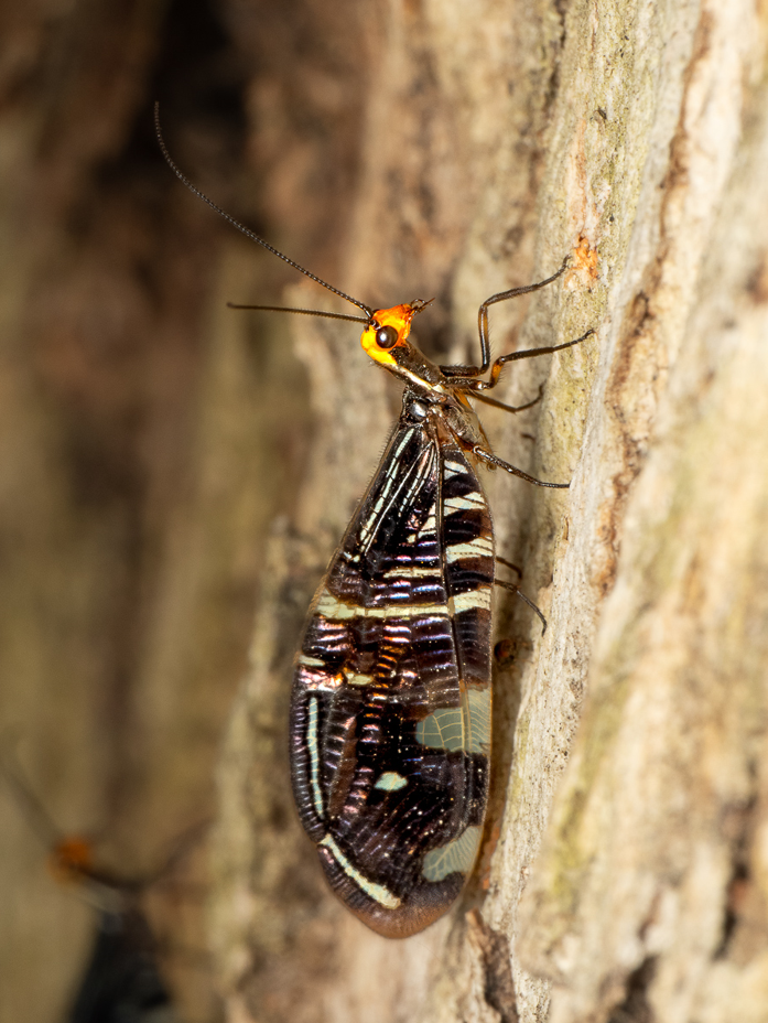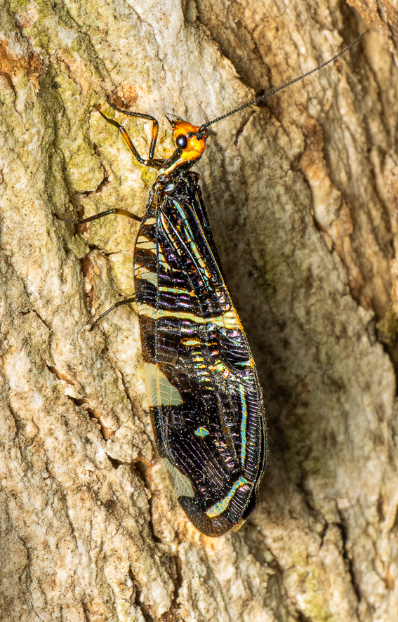 This unusual insect is a Pied Lacewing (Porismus strigatus), was found in mid-March in Blacks Walk. While it is widespread in the Southeast of Australia, there are only 285 records in the Atlas of Living Australia* records for Victoria. It is thought to be the first time it has been observed in our Creeklands.