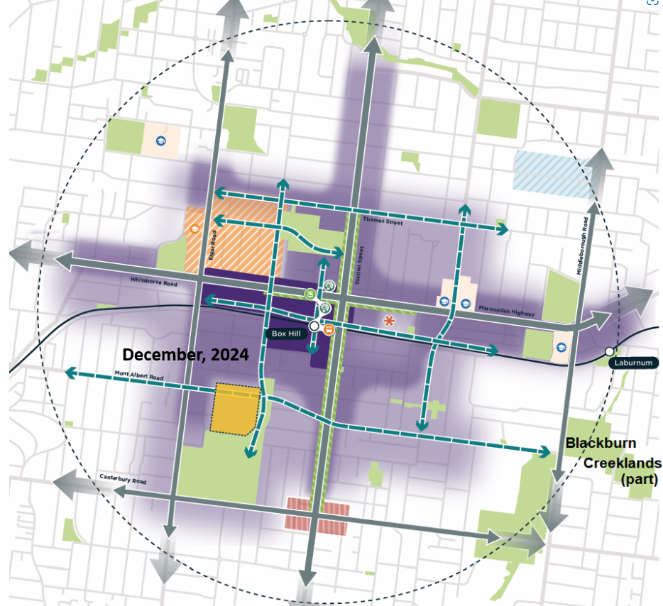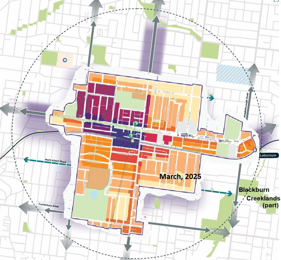 “Value capture” is predominantly to occur through rebuilding with higher-density homes (ie blocks of flats). The structure plan includes the Metropolitan Activity Centre formerly managed by Council. Box Hill already has a 50+ storey non-SRL development approved. Here’s how the latest Structure Plan looks: