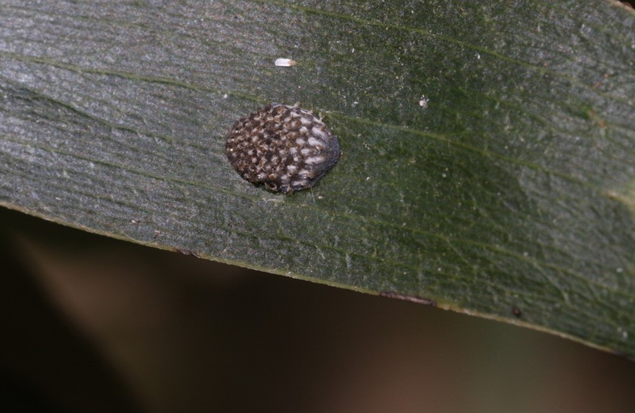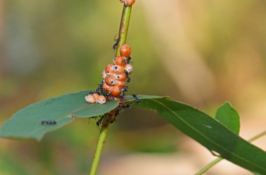 - Dotted Paropsine Leaf Beetle larvae (Paropsis atomaria): in the picture larvae can be seen emerging from their egg cluster. They feed on Eucalyptus species. The adult beetle is about a centimetre long and is somewhat ‘dome’ shaped.