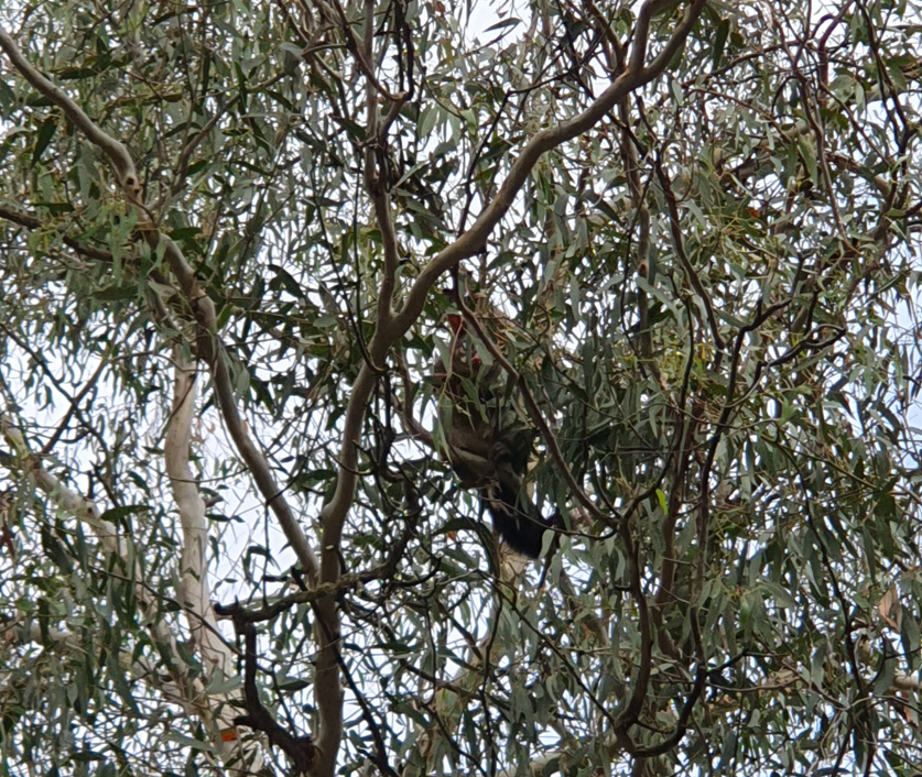 This Brushtail Possum was calmly feeding in (overcast) broad daylight right above the main track on 23/3 at 10:45 in the morning. Normally nocturnal, our attention to the possum’s presence was drawn by the local birdlife being most upset about its presence. Pied Currawongs and Noisy Miners were doing their best to scare it away via swooping and loud calls – it does look rather like a large cat after all.