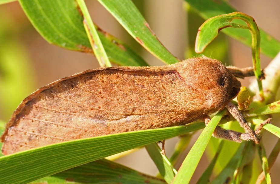 - Swift or Ghost Moth (Elhamma australasiae): a member of Swift or Ghost Moths family. This female is one of several local moths that, as caterpillars feed on the roots of plants. They emerge as adults in Autumn, leaving behind a distinctive empty cocoon that can often be found sticking out of the ground after rain.