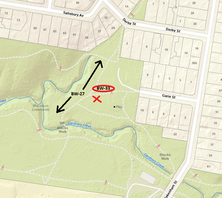 For Thursday 17/4, we shall be back in Blacks Walk again – aiming to weed out the small bed BW-33 – then do the priority work in BW-27 while keeping out of the sun. We’ll meet near BW-33 on the map below (same spot as last week).