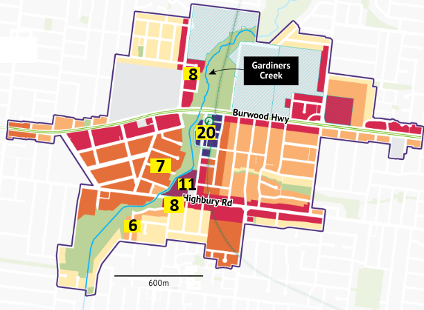 This map (adapted from The Age 29/4) shows the maximum storeys allowed near the creek as proposed by the SRLA: