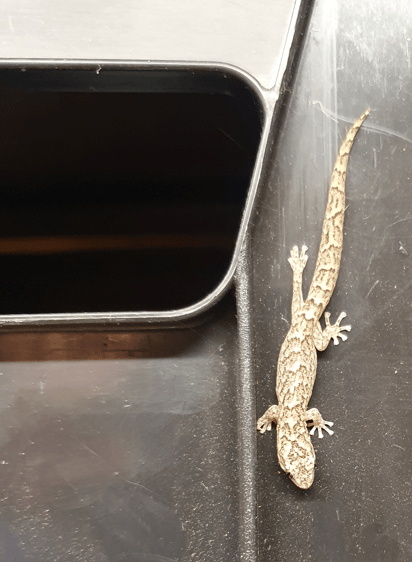 This 7cm long creature was found in a garden shed defying gravity on the side of a plastic utility cube. Even though its colouration is lighter and the lizard is somewhat smaller, it seems quite likely to be of the same species – maybe a juvenile ?