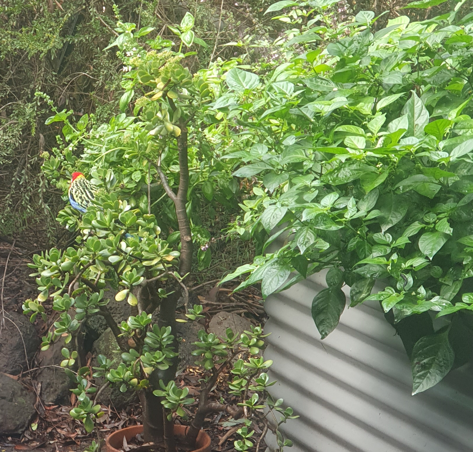 One of our park neighbours gave us this shot of an Eastern Rosella using a pot plant to reach basil flowers/seeds hanging out of the raised vegie bed. We reckon there might be a basil-flavoured Rosella tomato sauce on the supermarket shelves soon ! Oddly enough, the bird left the chillis on the right well-alone…