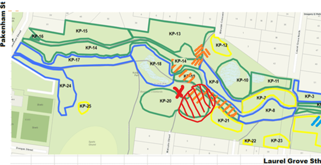 We’ll also redeploy some logs to signal the mower man and walkers not to re-enter the area – ahead of “Reveg Area” signage going up. Excepting along the track and in the NW corner of the bed, this area has not been worked on by us in living memory! The primary area of concern is the red-hatched zone below – we’ll venture into the other side of KP-20 if time and resources permit.