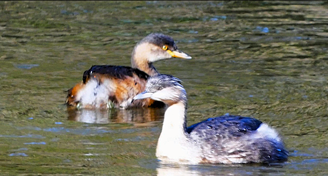 Russell’s photo shows the two local species of Grebes together on Blackburn Lake: the Australasian Grebe, also known as the Little Grebe, (Tachybaptus novaehollandiae) at rear and the Hoary-headed Grebe (Poliocephalus poliocephalus – not a typo!) at front.