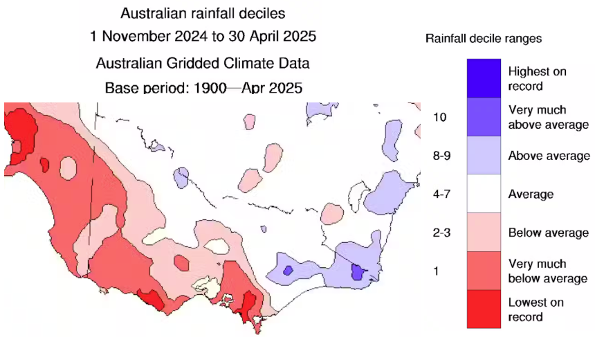Nationally, it is well known that parts of South Australia are experiencing record droughts whereas the opposite is true for parts of Queensland and northern New South Wales. The map above, excerpted from the Bureau of Meteorology map for Australia for Nov 24 – Apr 25, shows the extremes we are seeing even in Victoria. Some parts of Victoria in the south-central and south-west parts are having record breaking dry periods – while parts of eastern Victoria are seeing very much above average wet periods over the past six months ! Our climate really does seem to be changing radically.