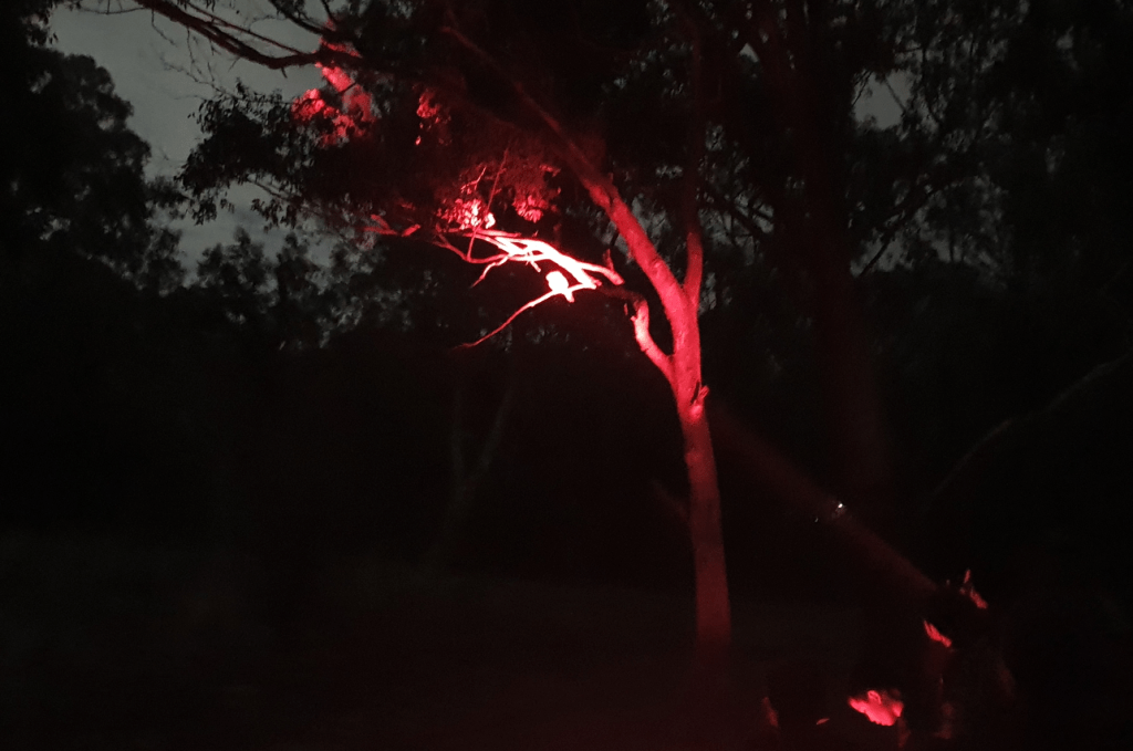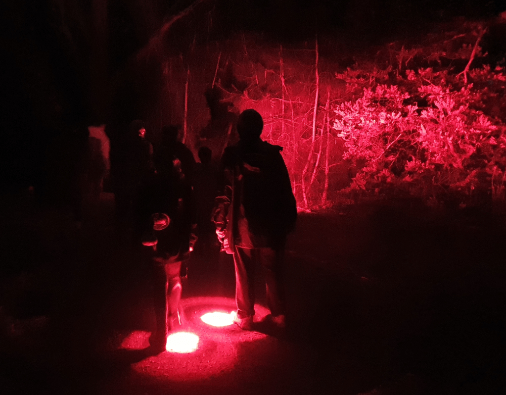 We used red light torches to find our nocturnal friends because red light is thought not to startle/dazzle the wildlife as much as white light.