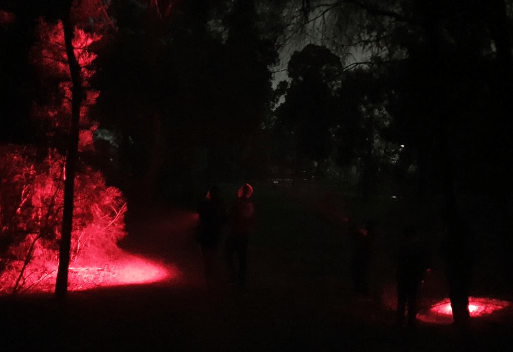 This was the first Possum Prowl we’ve run. Tanveer from Whitehorse Council helped organise the event and was one of the two group leaders on the evening. The other was Ian Moodie who is well known to many of us through his work leading our Bird Walks over many years. We were also very fortunate to have Su from Blackburn Lake Sanctuary assisting and providing some of the wildlife torches. Despite the initially threatening weather, the evening became mild, windless and dark – ideal for learning about the park’s night life. We are most grateful to the Scouts/Guides for the use of their hall – it was very convenient for our participants to be able meet there and reconvene later.