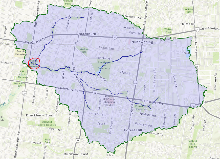 The map shows the surprising reach of our part of the KooyongKoot (Gardiners) Creek’s catchment. The stormwater system extends east to Mitcham through Nunawading including the “Megamile”, north to Springfield Road including the Blackburn North shopping centre, west into Box Hill and southwards into Blackburn South, and a substantial part of Forest Hill, including the Forest Hill Chase shopping centre, down to East Burwood.