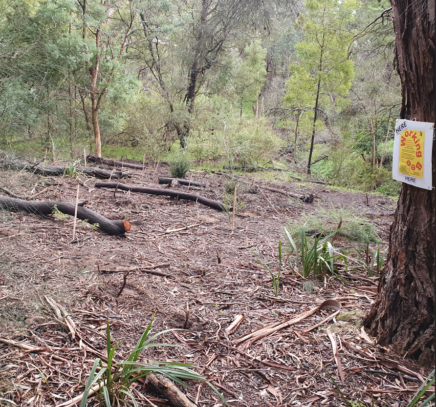 Helpfully, Council’s arborists/tree workers left a substantial amount of the fallen tree to provide habitat and help protect the young plants put in.