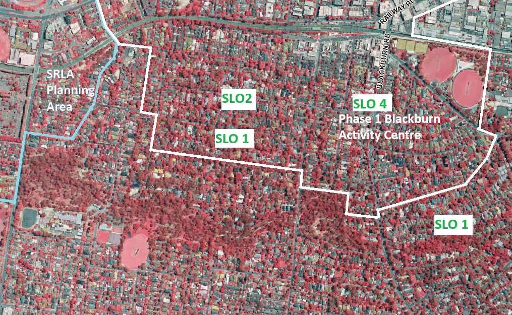 However, a very serious concern is that significant portions of the SLO1 & 2 and all of SLO4 overlays fall within the draft Phase 1 Blackburn Activity Centre area. This area is destined for high density development which will inevitably destroy significant parts of the tree canopy. The boundary for the proposed Activity Centre is shown in white – it bumps into the SRLA Planning Area (pale blue) to the west.