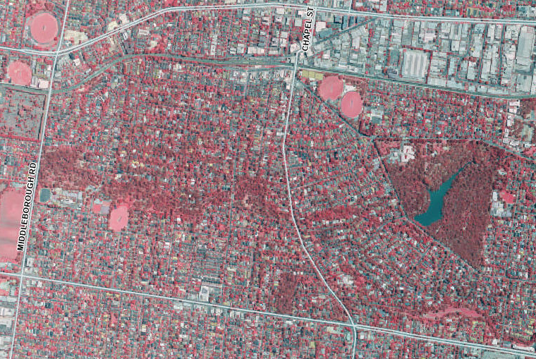 Council has published maps below which show changes in the level of vegetation within the municipality. We show a segment for Blackburn along with 2024 Near Infrared (NIR) photography in the slider: