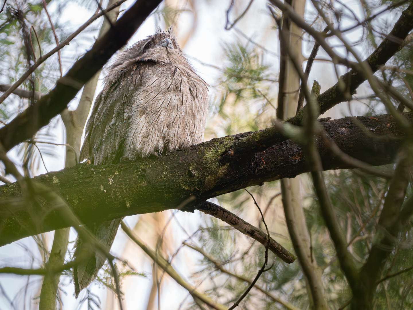 During the day, they seamlessly blend into their surroundings, perching motionless on branches with bodies stretched upright and eyes closed to mimic a broken branch. Their silvery-grey plumage sneakly matches the texture of tree bark so much so that you could easily pass by without even noticing them.