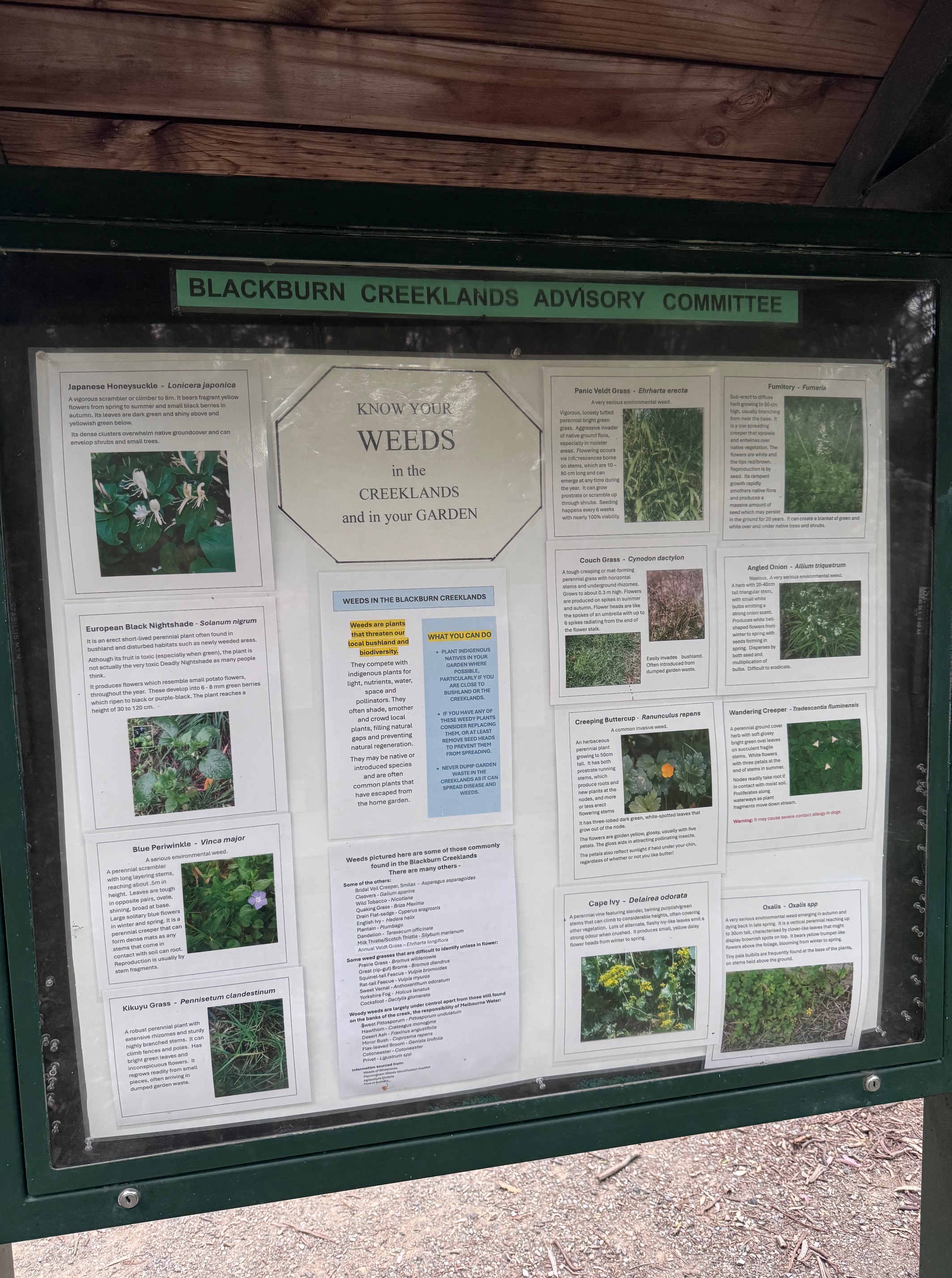 Thanks to Anthea for organising ‘Know your weeds in the creeklands and in your garden’ that is displayed in the back of the noticeboard this month. By definition, weeds are plants growing where they are not wanted and in competition with cultivated plants.