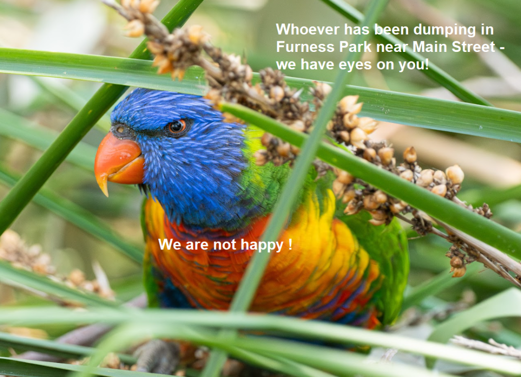 Dog poo bag, building material, household rubbish and garden waste dumping in the park became increasing problems early in the year – particularly in Furness Park. Council has been active with monitoring and signage, and fortunately things have quietened down a bit.