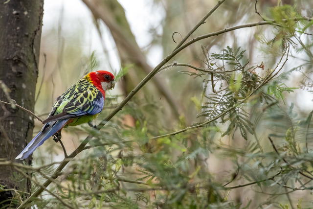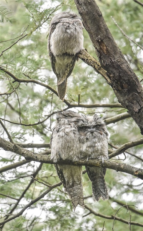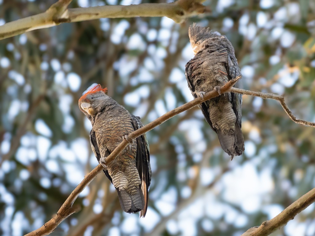 The endangered Gang-gang Cockatoos are back in the park after a short absence. About half a dozen birds have been seen together since mid-December. A young male (left) who is in the process of gaining the full bright red head feathers of the adult male. That’s probably his mum on the right (no red on her head).