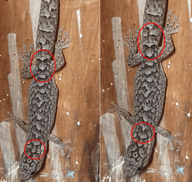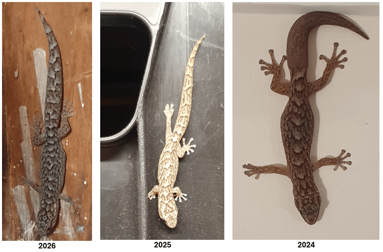 Clearly the markings and colouration of each are quite different – though we have read they can change colour – not instantly like chameleons, but over a few hours to match their environment. Our three must have moved (possibly to hunt insects) because they have seem to have contrasting colours – probably why our reporter saw them. The 2024 Gecko has a regenerated tail – they can drop their tail off as a decoy when threatened.