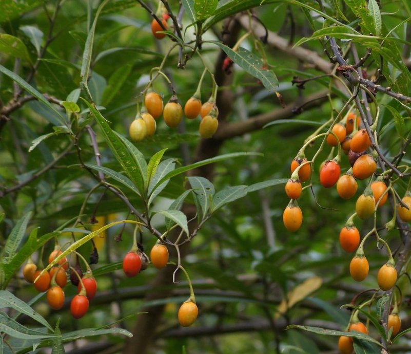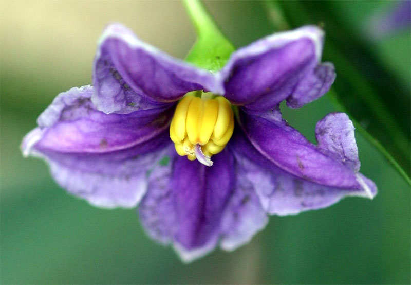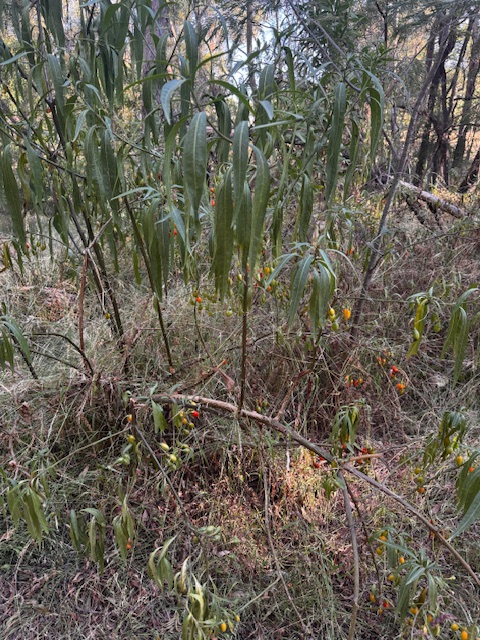 It is easily recognisable by its dark bluish-purple star-shaped flowers with bright yellow anthers (top right) and green-orange-red berries (bottom right). It provides valuable habitat and food for local wildlife, including birds and insects. The plant grows quickly to 4 meters and helps to stabilise the soil in disturbed areas.