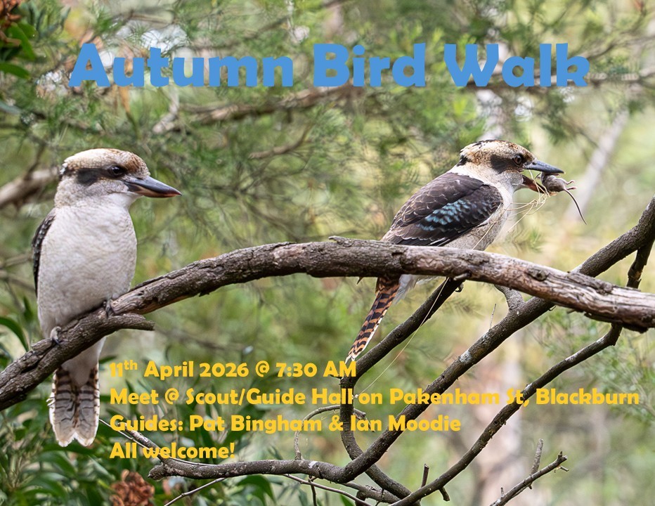 Our annual Autumn bird walk is fast approaching. This year it will be held on Saturday 11th April, starting at 7:30 AM at the Scout/Guide Hall in Pakenham St. Pat Bingham (Birdlife Australia) and Ian Moodie (formerly from Whitehorse Council) will be our leaders on the day. The plan is to separate into 2 groups and walk around the Blackburn Creeklands for approximately 1 hour and record all the birds we encounter along the way (visually and audibly). We will then return to the Scout/Guide Hall for a sociable morning tea and combine both sets of bird records.