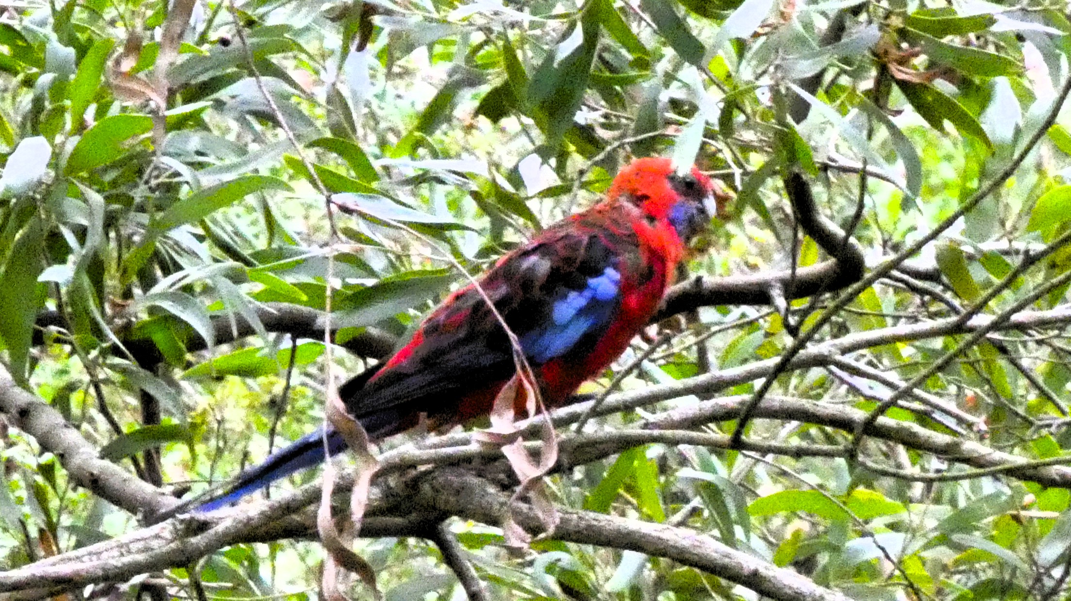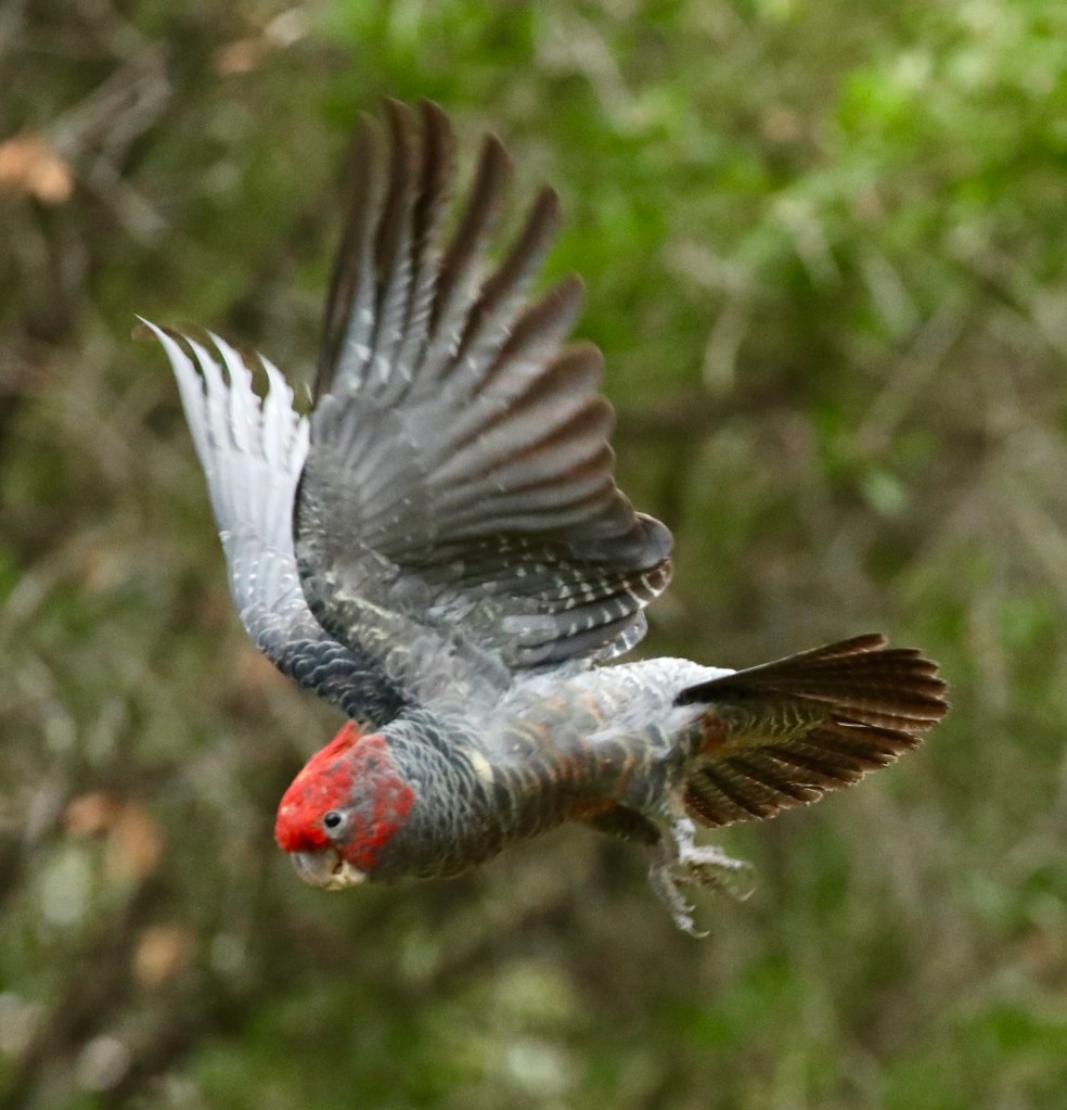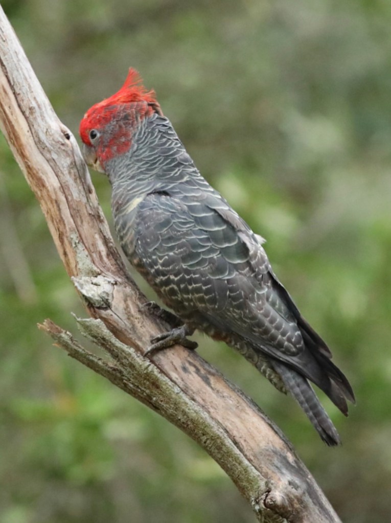 A family of Gang-gang Cockatoo was observed foraging in trees beside Gardiners Creek, feeding on seeds from the gumnuts of Lemon-scented Gum. The female was seen expertly cutting open seed pods and holding them with her foot while eating the seeds. Gang-gang Cockatoos mainly feed on seeds, fruits, nuts and insects, and drink daily from creeks, wetlands and birdbaths. During the breeding season (October–January) they form small family groups and nest in hollows of mature trees. Pairs share incubation of two to three eggs and continue caring for young for several weeks after fledging.