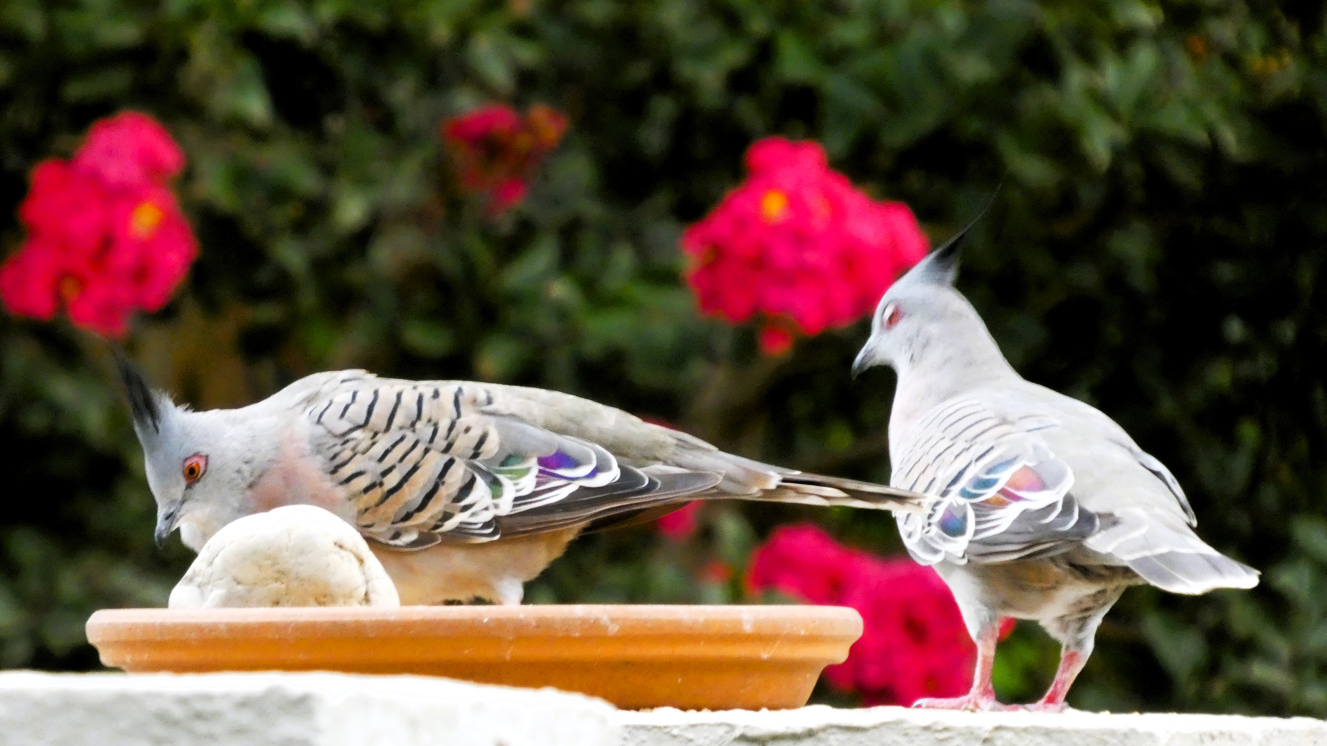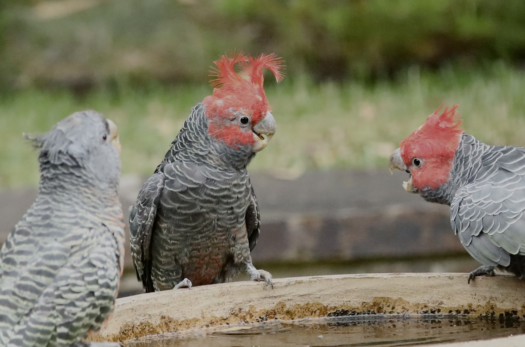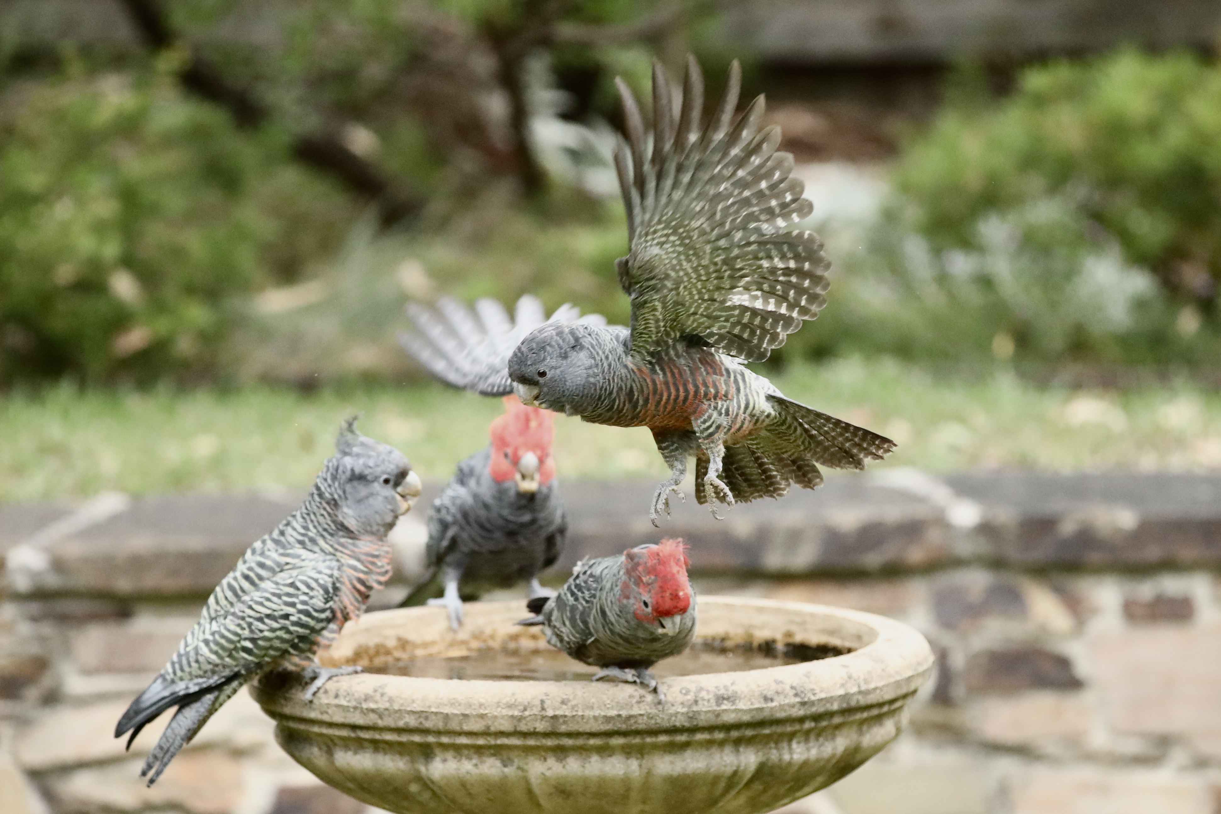 A family of Gang-gang Cockatoo was observed foraging in trees beside Gardiners Creek, feeding on seeds from the gumnuts of Lemon-scented Gum. The female was seen expertly cutting open seed pods and holding them with her foot while eating the seeds. Gang-gang Cockatoos mainly feed on seeds, fruits, nuts and insects, and drink daily from creeks, wetlands and birdbaths. During the breeding season (October–January) they form small family groups and nest in hollows of mature trees. Pairs share incubation of two to three eggs and continue caring for young for several weeks after fledging.