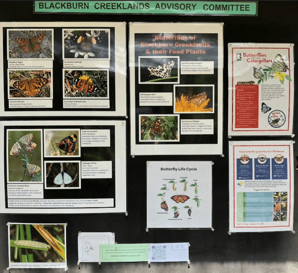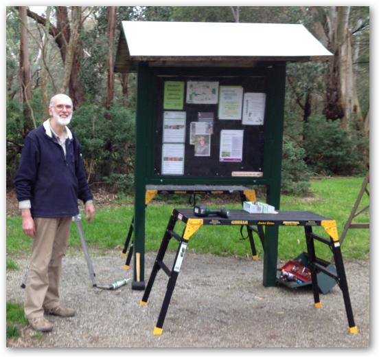 The Blackburn Creeklands Advisory Committee maintains a noticeboard on the south side of the creek at the Pakenham Street end of Kalang Park adjacent to the Blackburn Bowls Club. Our photo shows Friend Jim who coordinated a project to replace the noticeboard’s tin roof – successfully returning it to its original waterproof state.