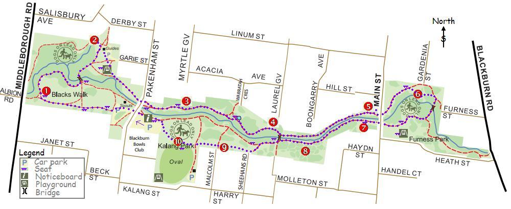 Of course you can start anywhere you like and travel in any direction for all or part of the walk – but unless you are travelling clockwise you might find “The Cutting” harder to find and the mower track between “The Woodland” and “The MMBW House” is fairly steep – so better going downhill!