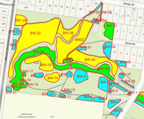 - The management areas of the Blackburn Creeklands parks were formerly referred to as Blocks and are referenced by the park name (F=Furness Park, K=Kalang Park, B=Blacks Walk) then N=North of Creek, S=South of Creek and then a block number.