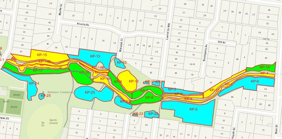 - We refer to the creek and its banks separately because the they have quite separate characteristics to the adjacent parkland. Most land areas typically run up to the top of the creek bank but do not include the creek and its banks. The area along the creek is given the same number as adjacent blocks but with a ‘C’ added.