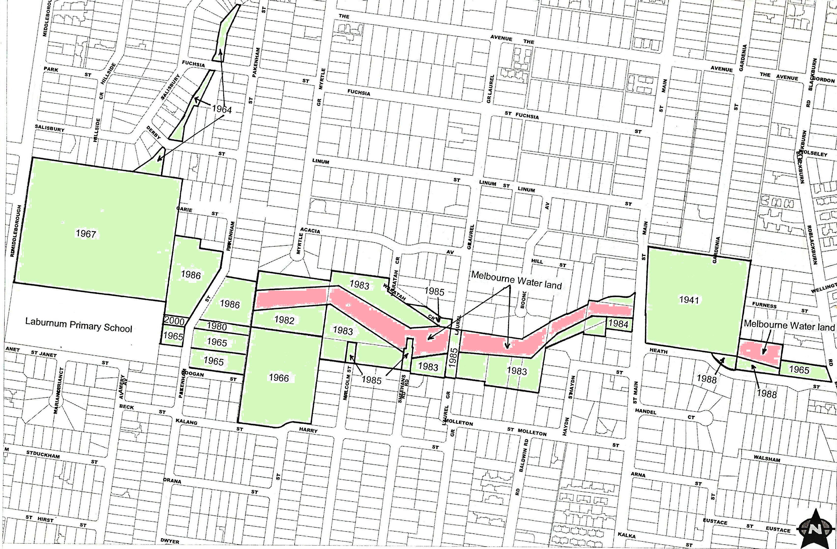 This map, sourced from the Blackburn Creeklands Master Plan (2002), shows the history of property acquisition for the park graphically (click to enlarge):