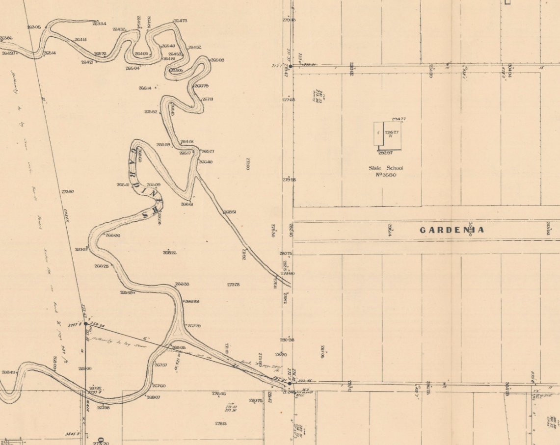 - The plan below is excerpted from an MMBW survey plan from 1938. It shows a small section of Gardiners Creek in our Furness Park in the vicinity of Gardenia Street. Interestingly, it also shows the Open-air School with its verandah facing Gardiners Creek (though its actual State School number was 3850 for the pedantic).
